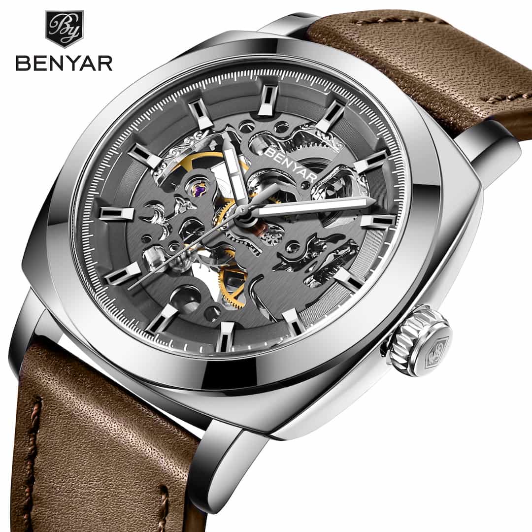 Dodajte svojemu videzu eleganco z moško ročno uro Benyar Mechanical Skeleton Silver Brown