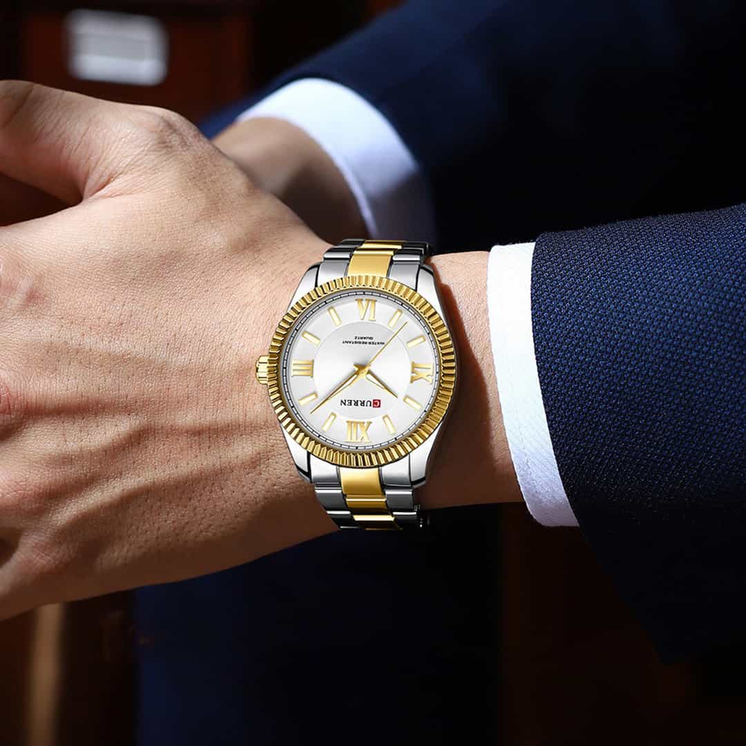 Curren Regent Gold/White združuje klasičen dizajn, vrhunske materiale in funkcionalnost, kar jo naredi popolno za vsako priložnost. Njena brezčasna bela številčnica z rimskimi številkami in luksuzna zlato-srebrna kombinacija izžarevata prestiž, medtem ko kakovostna izdelava zagotavlja dolgotrajno vzdržljivost. Če iščete elegantno in zanesljivo uro, ki bo dopolnila vaš slog, je ta model prava izbira za vas!
