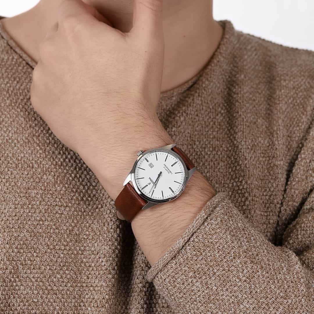 - Poslovni dizajn: Minimalistična bela številčnica in tanko jekleno ohišje se popolno ujemata z elegantnim rjavim usnjenim paščkom.