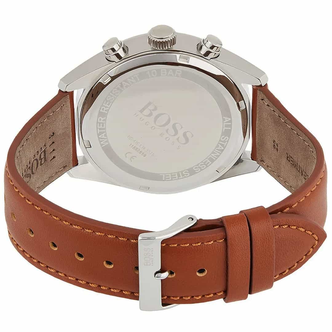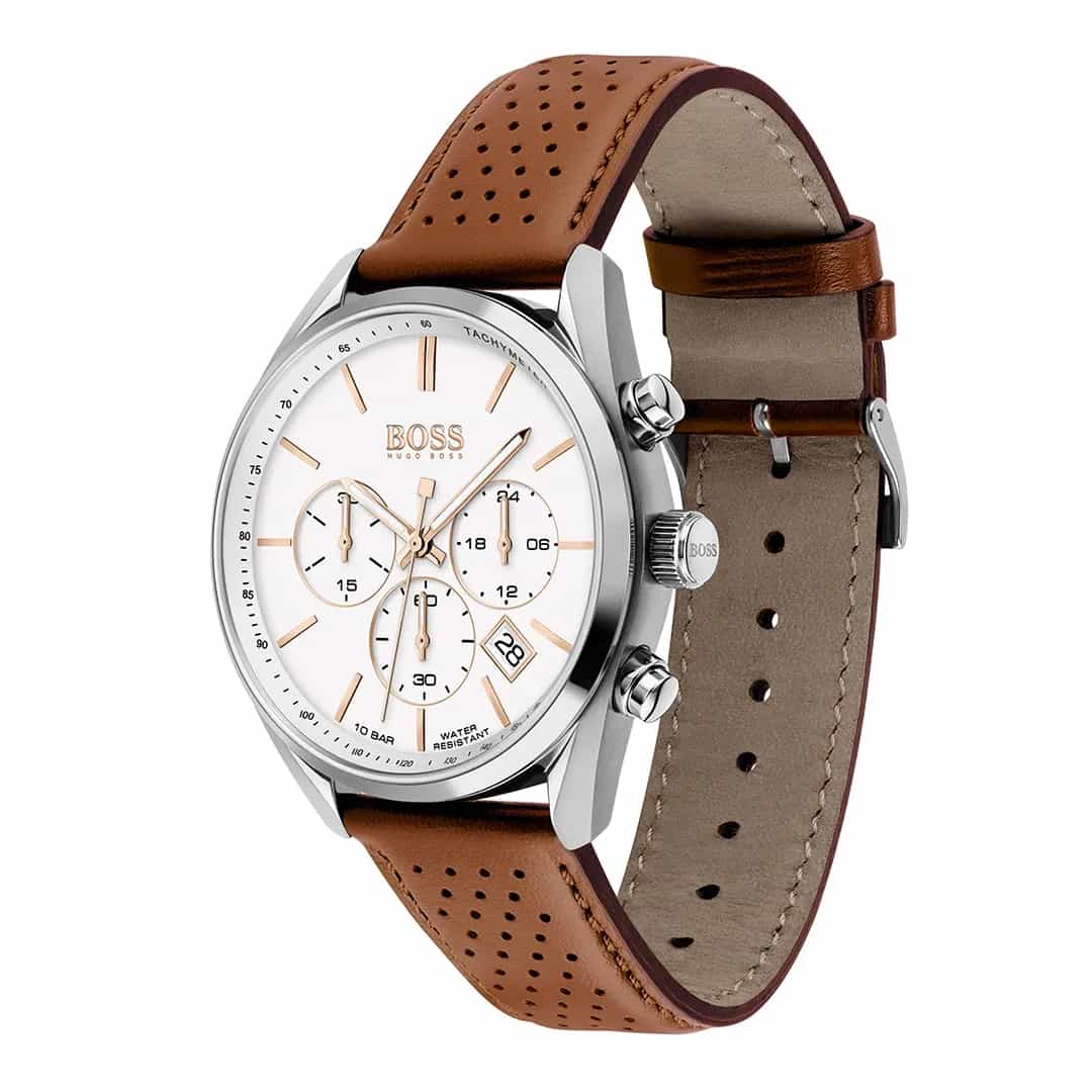 Moška ročna ura Hugo Boss Champion 1513879 združuje brezčasno eleganco, moderen dizajn in športno funkcionalnost v izjemno dovršeni svetli barvni kombinaciji. Srebrno ohišje, bela številčnica z detajli v rose gold barvi ter visokokakovosten svetlo rjav usnjen pašček ustvarjajo uravnotežen videz, ki izžareva sofisticiranost in sproščenost hkrati. Kronograf, prikaz datuma in vodoodpornost do 10 ATM pa zagotavljajo zanesljivo funkcionalnost za vsak dan.