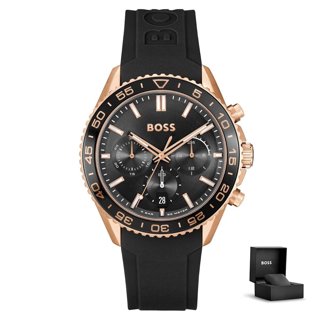 Moška ročna ura Hugo Boss Runner 1514168 združuje dinamičen športni dizajn in sodoben slog z elegantnim pridihom rožnatega zlata. Ohišje v barvi rose gold in silikonski pašček v črni barvi ustvarjata dovršeno kombinacijo prefinjenosti in športnega videza. Črna številčnica z jasno razporejenimi podštevilčnicami, skupaj z ujemajočim se črnim obročkom, poudarja eleganco in funkcionalnost. Robustna izdelava, funkcionalni kronograf, prikaz datuma ter vodoodpornost do 5 ATM poskrbijo za brezskrbno uporabo v vsakodnevnih situacijah. Luminiscenčni kazalci in urne oznake (lume) zagotavljajo odlično berljivost tudi v temi.