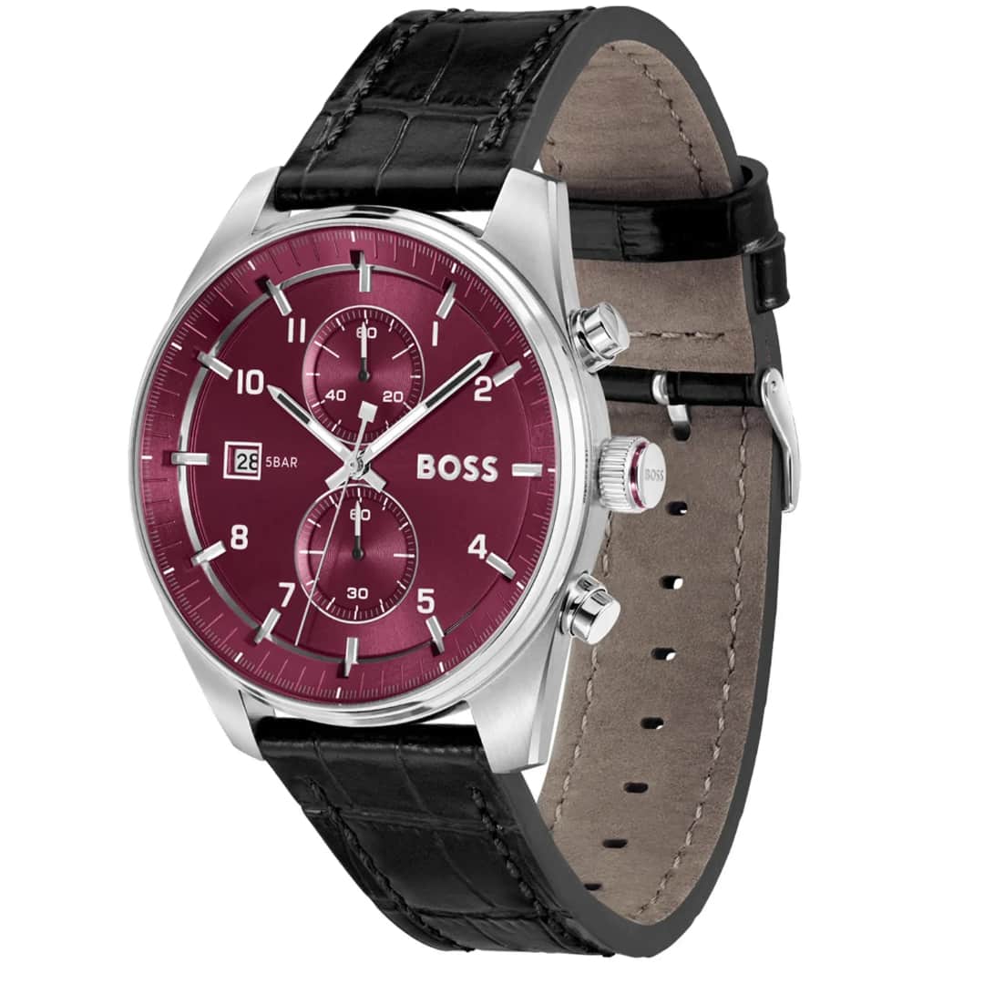 Moška ročna ura Hugo Boss Skytraveller 1514193 je popolna izbira za vse, ki si želijo prestižnega dodatka z edinstvenim značajem. Bordo številčnica pritegne pozornost s svojo izjemno barvo, medtem ko usnjen črn pašček nudi klasično udobje in eleganco. Idealna za poslovne priložnosti, posebne dogodke ali kot poseben darilni kos.