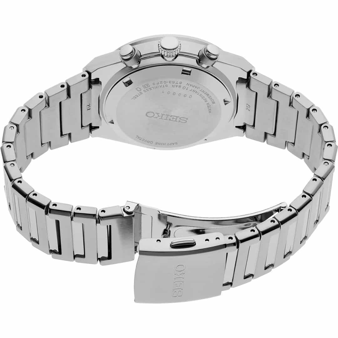 - Kvarčni mehanizem Seiko 8T63: Natančnost ±15 sekund na mesec in dolga življenjska doba baterije.