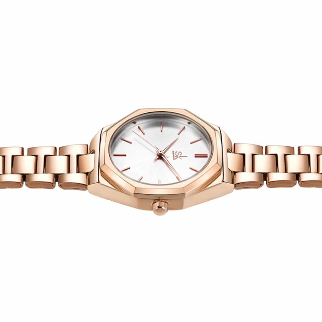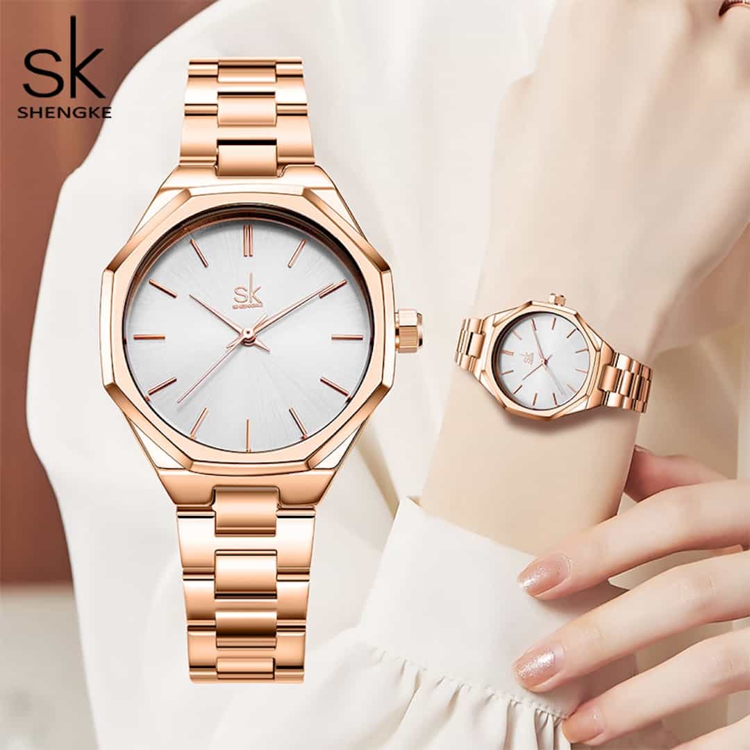 Ženska ročna ura SK Shengke Quantum Rose Gold – dodajte svojemu videzu pridih prefinjene elegance. Ta prefinjena ura ni le praktična, temveč tudi izraz vašega osebnega stila. Njen elegantni rožnato zlati dizajn z edinstveno srebrno številčnico in rožnato zlatimi kazalci bo zagotovo pritegnil pozornost in dodal prefinjenost vsaki vaši obleki, ne glede na priložnost.